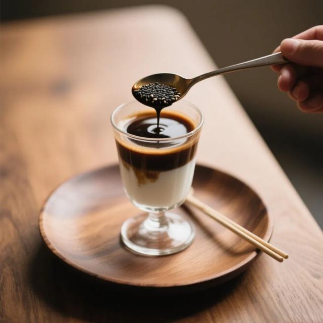 ·咖啡暴擊:緩緩倒入濃縮咖啡,見證咖啡液沖破芝麻醬防線,像水墨畫般暈染開的瞬間,這顏值必須先拍 300 張!