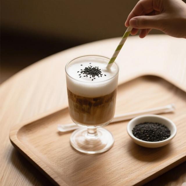 第一口就被濃郁的芝麻香直接擊中!咖啡的焦香、牛奶的奶香,再加上黑芝麻醬醇厚的絲滑感,三重口感在舌尖炸開,比普通拿鐵多了10086 種驚喜!喝完不僅提神醒腦,甚至覺得自己離烏黑秀發(fā)又近了一步,朋克養(yǎng)生人狂喜!