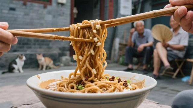 碼菜也有講究:黃瓜絲要切得細(xì)如發(fā)絲,綠豆芽得用沸水焯到斷生,再配上點焯過的菠菜段。把醬一澆,菜一撒,筷子攪開的瞬間,芝麻香混著菜香直往鼻子里鉆,呼嚕嚕吃下去,額頭上冒點小汗,暑氣全消。