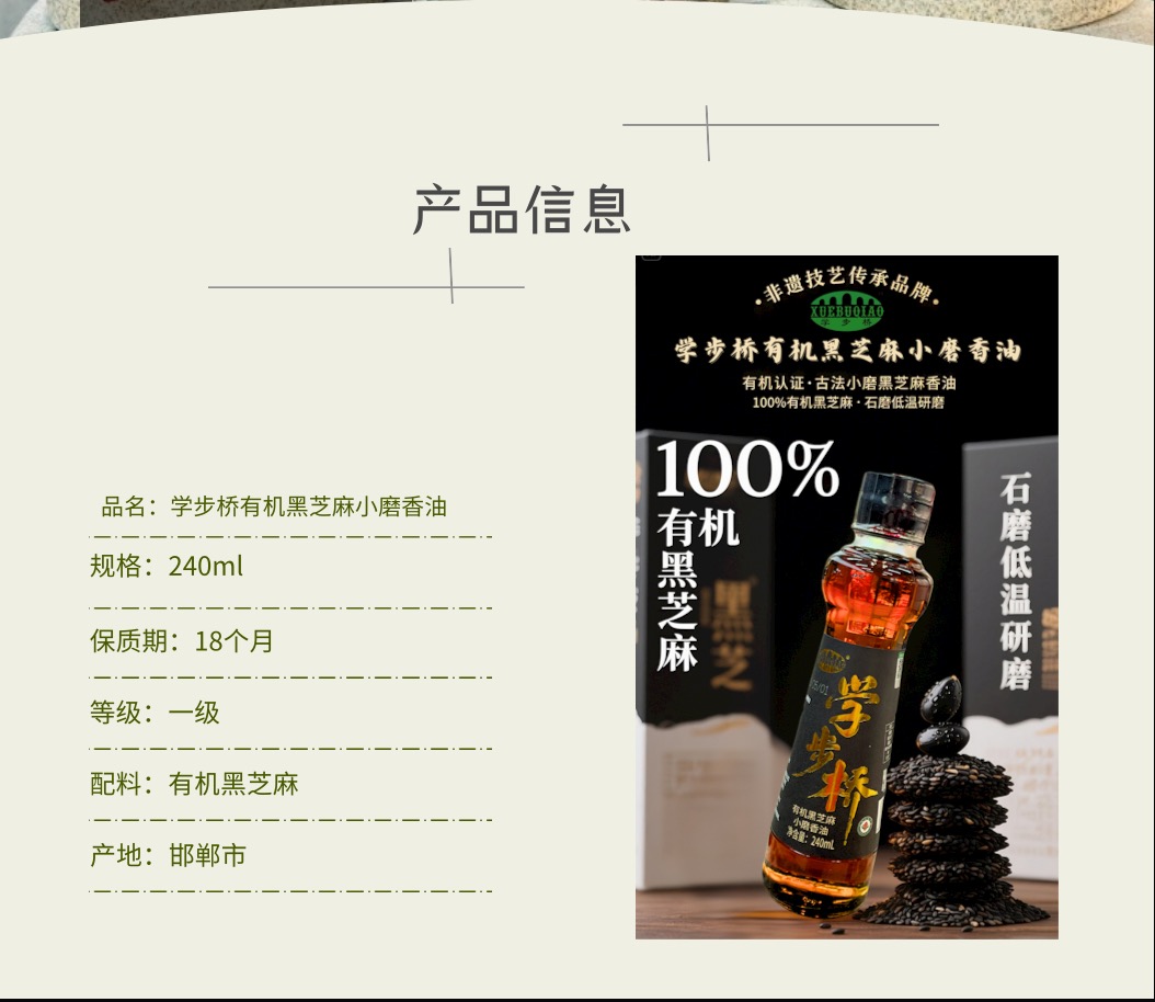 學步橋有機黑芝麻小磨香油,原料精選有機黑芝麻,天然又營養(yǎng),品質有保障。不含多余添加劑,純芝麻原香。遵循GB/T 8233國家標準,采用傳統(tǒng)水代法工藝,不僅最大程度保留芝麻原香和營養(yǎng),而且天然純凈、安全健康。質量等級一級,無論是涼拌、熱炒還是做湯,滴上幾滴,香氣四溢,既能享受濃郁芝麻香,又能攝取芝麻中的營養(yǎng)成分,給您的美食增添純正風味!為您的健康再加分!
