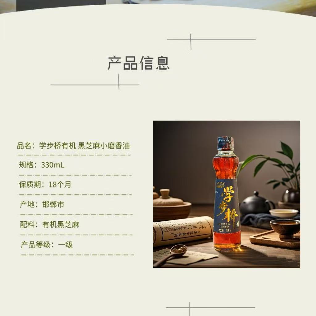 學(xué)步橋有機(jī)黑芝麻小磨香油,原料精選有機(jī)黑芝麻,天然又營養(yǎng),品質(zhì)有保障。不含多余添加劑,純芝麻原香。遵循GB/T 8233國家標(biāo)準(zhǔn),采用傳統(tǒng)水代法工藝,不僅最大程度保留芝麻原香和營養(yǎng),而且天然純凈、安全健康。質(zhì)量等級一級,無論是涼拌、熱炒還是做湯,滴上幾滴,香氣四溢,既能享受濃郁芝麻香,又能攝取芝麻中的營養(yǎng)成分,給您的美食增添純正風(fēng)味!為您的健康再加分!